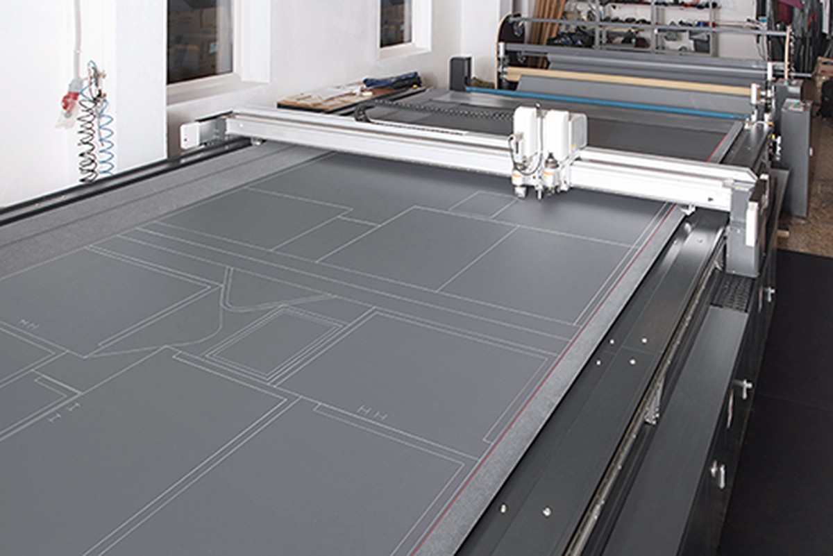 Раскройный участок ткани ПВХ перерабатывает до 1 млн. кв. м. ткани ПВХ в год и оснащен двумя промышленными машинами автоматического цифрового раскроя с интеллектуальной системой управления и лазерным контролем. Конвейерная система подачи ткани, три модуля с тремя инструментами позволяют нам одновременно производить раскрой материала с лазерной точностью, а также наносить конструкторскую и сборочную разметку на выкройки.