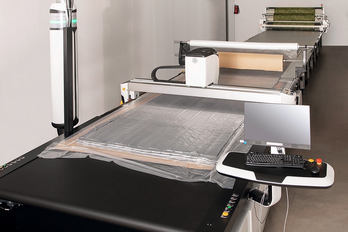 Чтобы обеспечить высокий темп работы раскройного комплекса, мы дооснастили его автоматической настилочной машиной и многосекционным настилочным столом с поддувом.
